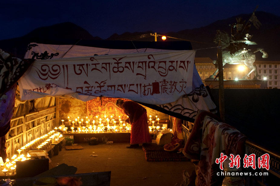2010年4月18日,青海玉樹結(jié)古鎮(zhèn)格薩爾王廣場,雪域阿日香巴拉凈土五明佛學院搭建了帳篷,免費為民眾提供酥油燈,為地震遇難者祈禱。中新社發(fā) 盛佳鵬 攝