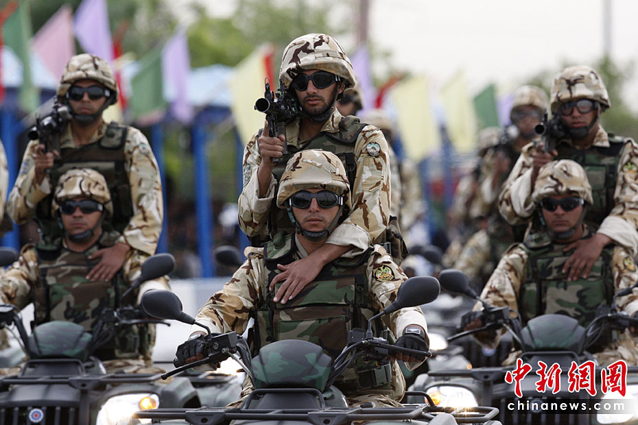 4月18日,伊朗德黑蘭舉行伊朗建軍節(jié)閱兵式。伊朗在閱兵式上展出了“力量”、“流星”和“泥石”等地對地導彈。圖片來源:中國新聞網(wǎng)
