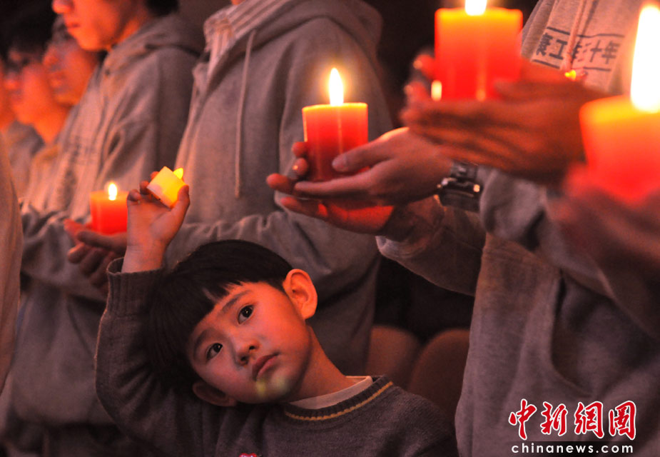 4月19日晚,著名音樂人郭峰在北京清華大學(xué)舉辦了“祈福——情系玉樹災(zāi)區(qū)”現(xiàn)代流行鋼琴燭光音樂會,這是文藝界為抗震救災(zāi)特獻(xiàn)的首個公益演出。郭峰用鋼琴演奏了《聽!、《真心英雄》、《心會跟愛一起走》、《堅強(qiáng)的心》、《希望的陽光》等多首主調(diào)凝重、祈福、激勵、昂揚的樂曲,F(xiàn)場觀眾是來自首都各大高校的大學(xué)生們,他們手中搖曳著燭光,眼含熱淚,在音樂的旋律中為災(zāi)區(qū)祈福。圖為一位小朋友和大學(xué)生們一起點起了燭光。中新社發(fā) 李學(xué)仕 攝
