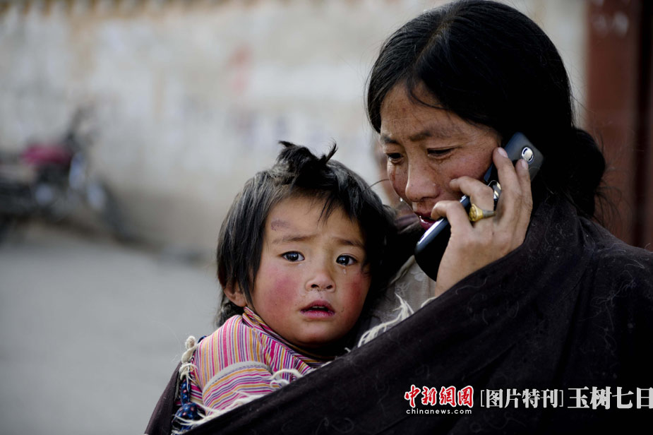 4月15日,青海玉樹縣體育場的地震災(zāi)民安置點內(nèi),一位母親在與親人通話時潸然淚下,懷里小女兒的腳傷還在等待醫(yī)治。中新社發(fā) 廖攀 攝