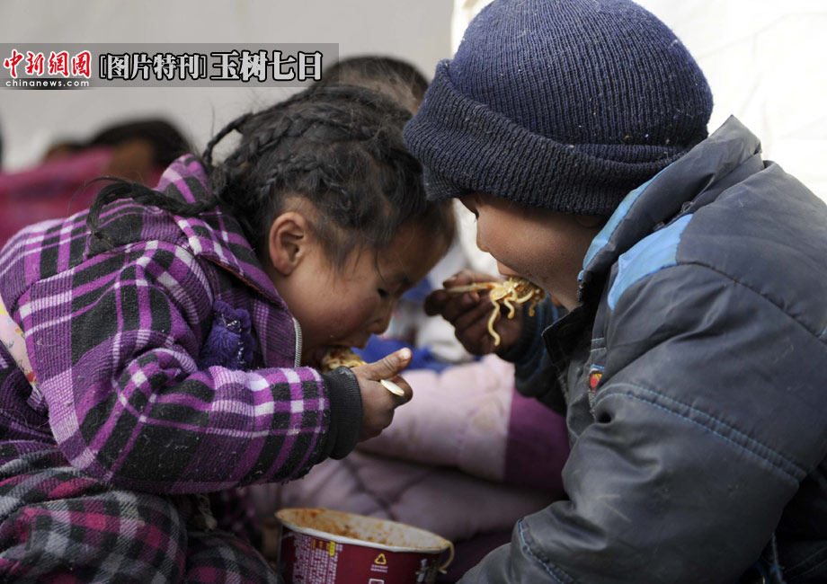 4月15日,青海玉樹縣體育場的地震災民安置點,兩名受災孩童分食一盒方便面,一根不剩。中新社發(fā) 廖攀 攝