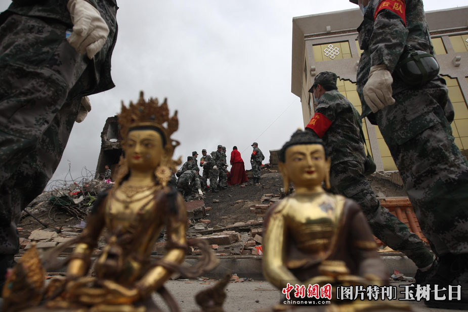 4月17日,青海玉樹結(jié)古鎮(zhèn)民主路,解放軍救援隊(duì)為受災(zāi)民眾從房屋廢墟內(nèi)搜索出多件法器。中新社發(fā) 盛佳鵬 攝