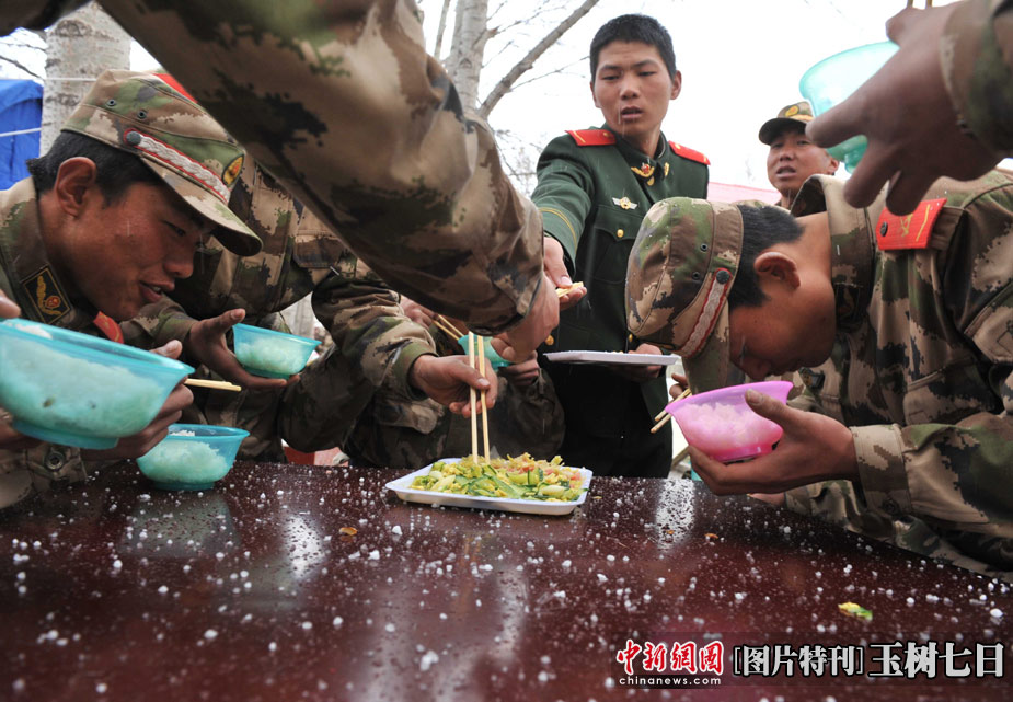 4月20日中午時分,玉樹地震災區(qū)突然雷雹交加,正在現(xiàn)場救援的青海武警總隊官兵只能在冰雹中吃午餐。中新社發(fā) 賈國榮 攝