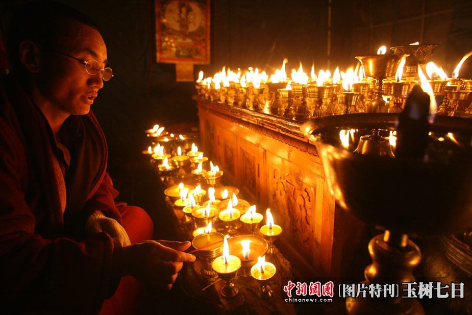 2010年4月18日,青海玉樹結(jié)古鎮(zhèn)格薩爾王廣場(chǎng),雪域阿日香巴拉凈土五明佛學(xué)院搭建了帳篷,免費(fèi)為民眾提供酥油燈,為地震遇難者祈禱。中新社發(fā) 蘇丹 攝