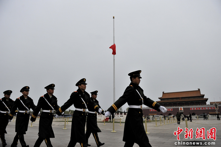 4月21日早晨,北京天安門(mén)廣場(chǎng)下半旗向玉樹(shù)地震遇難者致哀。中新網(wǎng)記者 金碩 攝