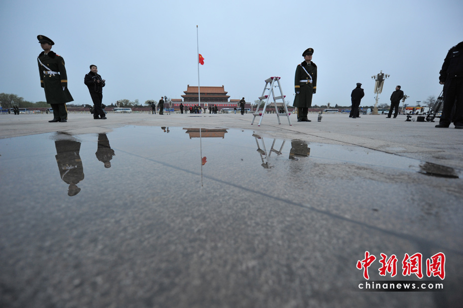 4月21日早晨,北京天安門廣場下半旗向玉樹地震遇難者致哀。中新網(wǎng)記者 金碩 攝