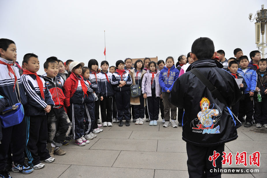 4月21日清晨,廊坊第十二小學(xué)的小學(xué)生來到天安門廣場(chǎng)朗讀自己的作文悼念青海玉樹地震的遇難同胞。中新網(wǎng)記者 金碩 攝