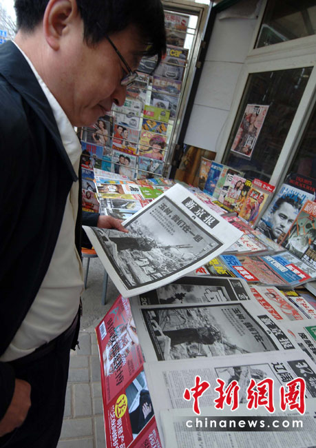 4月21日,按照中國(guó)國(guó)務(wù)院決定,舉行全國(guó)哀悼活動(dòng),全國(guó)和駐外使領(lǐng)館下半旗志哀,停止公共娛樂活動(dòng)。當(dāng)日北京各家報(bào)社刊出悼念玉樹地震遇難同胞特刊,并撤銷了一切彩色圖片和字頭,采用黑白版面。中新社發(fā) 鄒憲 攝