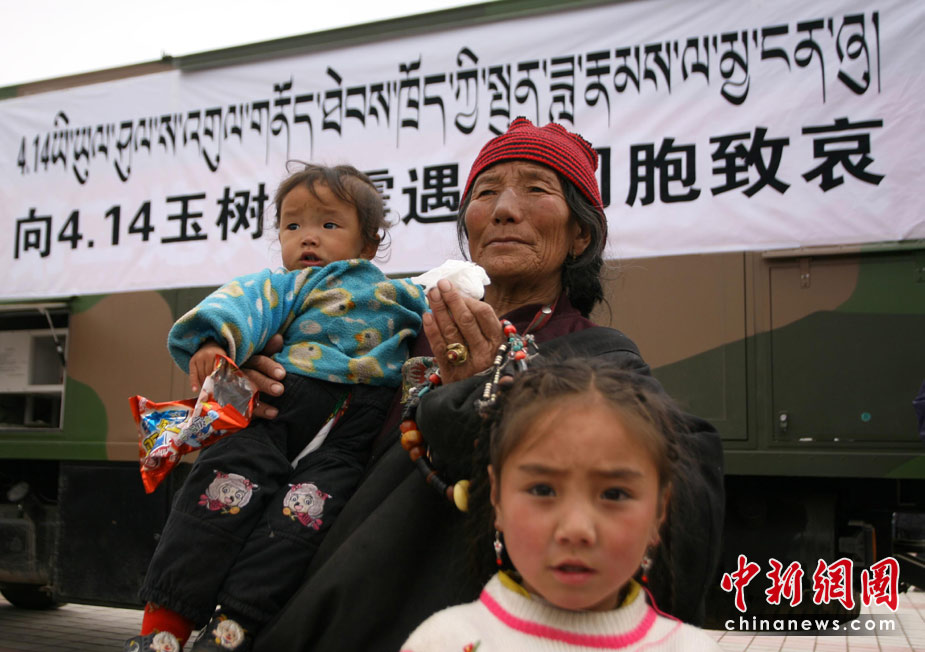 4月21日,為表達(dá)全國(guó)各族人民對(duì)青海玉樹(shù)地震遇難同胞的深切哀悼,舉行全國(guó)哀悼活動(dòng)。玉樹(shù)的悼念活動(dòng)在結(jié)古鎮(zhèn)舉行,在玉樹(shù)體育場(chǎng)、賽馬場(chǎng)、格薩爾廣場(chǎng)等安置點(diǎn),當(dāng)?shù)孛癖姾途仍筷?duì)自發(fā)舉行哀悼活動(dòng)。中新社發(fā) 劉忠俊 攝