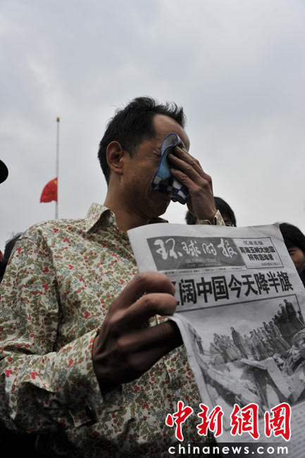 4月21日,為表達(dá)全國(guó)各族人民對(duì)青海玉樹地震遇難同胞的深切哀悼,中國(guó)國(guó)務(wù)院決定,舉行全國(guó)哀悼活動(dòng),全國(guó)和駐外使領(lǐng)館下半旗志哀,停止公共娛樂(lè)活動(dòng)。圖為北京天安門廣場(chǎng)上哀悼遇難者的民眾。中新網(wǎng)記者 金碩 攝