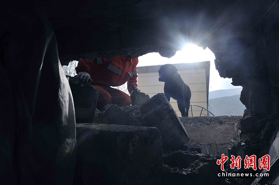 名貴的黑貝犬是中國國家救援隊趕赴青海玉樹地震災(zāi)區(qū)6只搜救犬隊成員之一,身價近百萬元人民幣。4月21日清晨八時許,它在救援隊員的帶領(lǐng)下,到玉樹地震災(zāi)區(qū)中心商業(yè)街廢墟里,四處奔波,盡職盡力尋找生命跡象。10時后,他和救援隊員都出現(xiàn)高原反應(yīng),暫時休整,準備再戰(zhàn)。賈國榮 攝