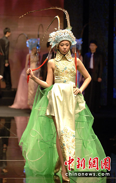 4月20日晚,首屆海西國際時裝周在福建石獅閉幕,本屆時裝周吸引了來自海峽兩岸的紡織服裝界企業(yè)家和知名服裝設(shè)計師。期間舉辦了12場時裝品牌和設(shè)計師作品動態(tài)發(fā)布會。圖為模特展示古今潮流結(jié)合的服裝。王東明 攝