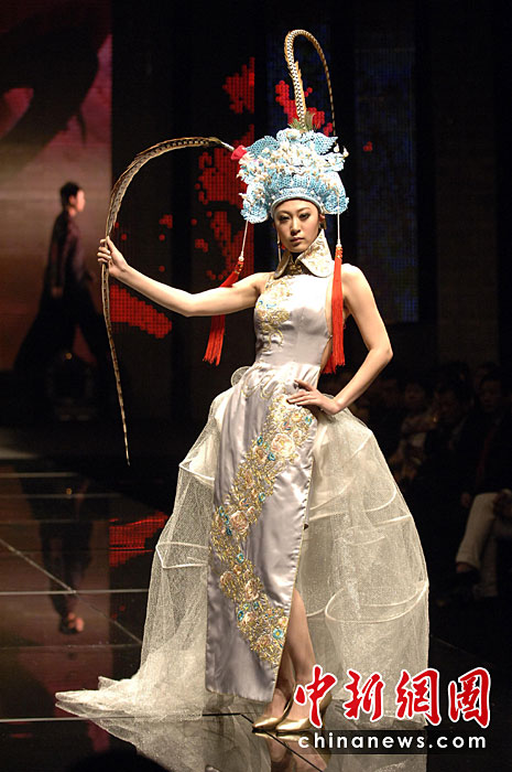 4月20日晚,首屆海西國際時裝周在福建石獅閉幕,本屆時裝周吸引了來自海峽兩岸的紡織服裝界企業(yè)家和知名服裝設計師。期間舉辦了12場時裝品牌和設計師作品動態(tài)發(fā)布會。圖為模特展示古今潮流結合的服裝。王東明 攝
