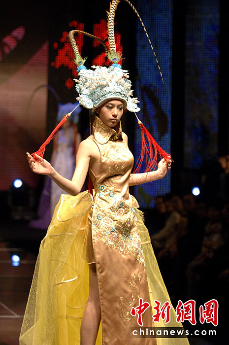 4月20日晚,首屆海西國際時裝周在福建石獅閉幕,本屆時裝周吸引了來自海峽兩岸的紡織服裝界企業(yè)家和知名服裝設計師。期間舉辦了12場時裝品牌和設計師作品動態(tài)發(fā)布會。圖為模特展示古今潮流結(jié)合的服裝。王東明 攝