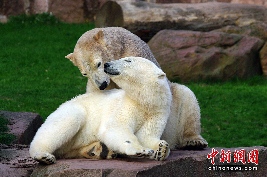 4月23日,德國(guó)紐倫堡動(dòng)物園內(nèi),兩頭北極熊在公園內(nèi)的水池中盡情玩耍,享受春天的陽光。圖片來源:中國(guó)新聞網(wǎng)
