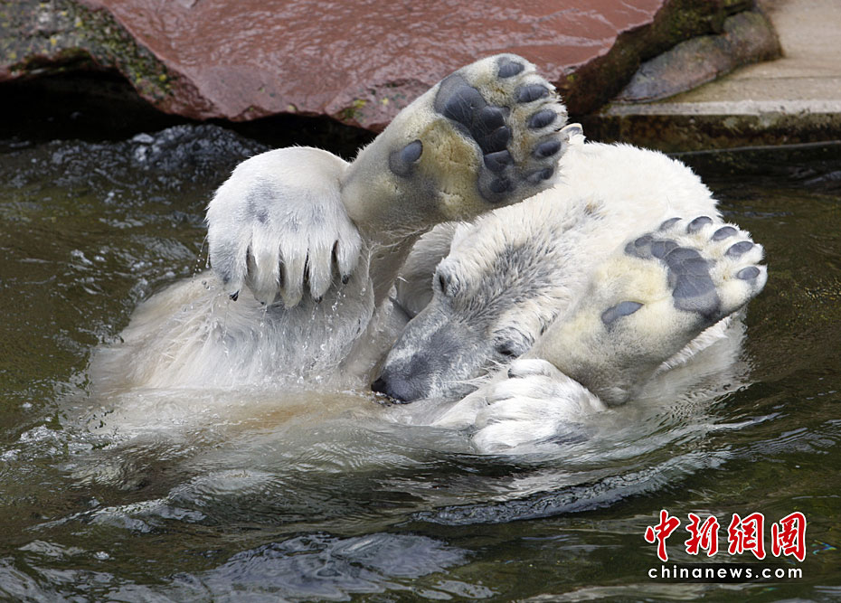 4月23日,德國(guó)紐倫堡動(dòng)物園內(nèi),兩頭北極熊在公園內(nèi)的水池中盡情玩耍,享受春天的陽(yáng)光。圖片來(lái)源:中國(guó)新聞網(wǎng)