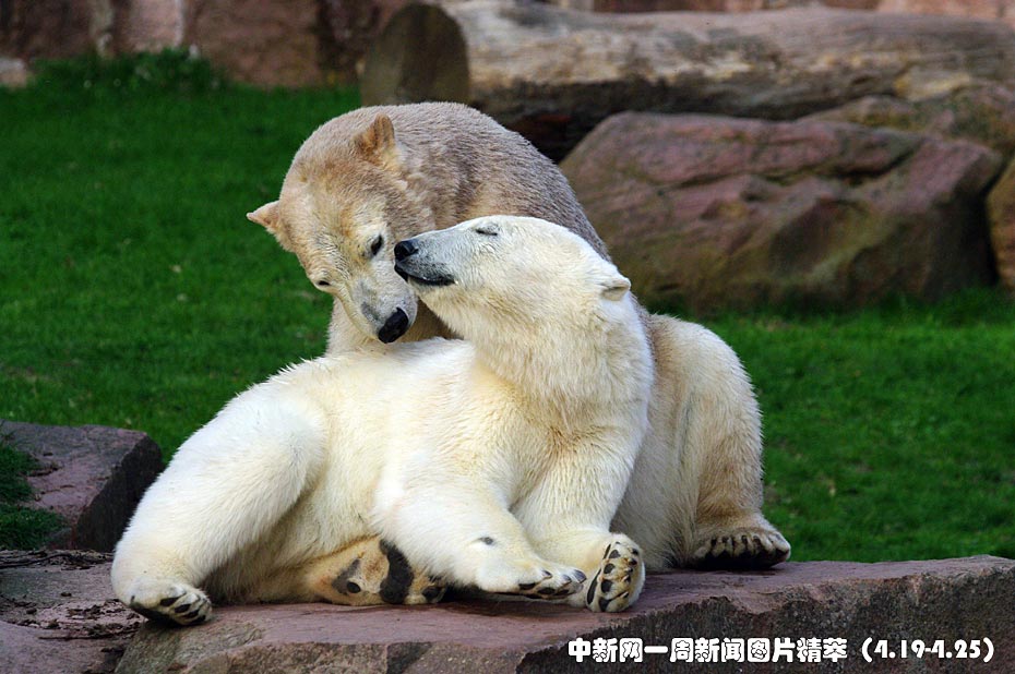 周五(23日),德國(guó)紐倫堡動(dòng)物園內(nèi),兩頭北極熊在公園內(nèi)的水池中盡情玩耍,享受春天的陽(yáng)光。