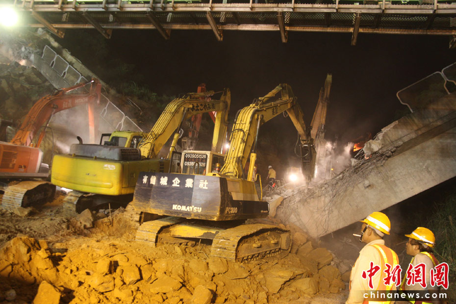 4月25日, 臺(tái)灣一條交通要道、“北二高”基隆段發(fā)生山崩意外,傾瀉而下的土石壓垮一座高架橋,并覆蓋道路約200米,據(jù)傳有人車(chē)被埋。圖為工程人員連夜開(kāi)挖,展開(kāi)大搜救。 中新社發(fā) 董會(huì)峰 攝