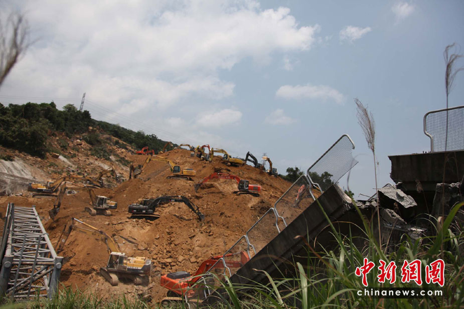 4月26日,臺(tái)灣“北二高”基隆段山崩斷橋意外第2天,大批工程人員使用近50臺(tái)怪手持續(xù)開挖,但尚未尋獲被埋的車輛和失蹤者。這起“走山”斷橋意外發(fā)生在25日,一座高百米的山坡全然崩坍,土石覆蓋道路長(zhǎng)約200米、面積達(dá)3個(gè)足球場(chǎng)之大,令南下北上的交通大受影響。 董會(huì)峰 攝