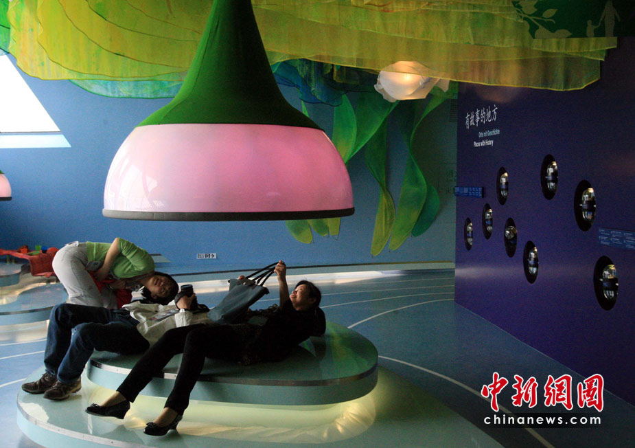 4月27日,三位年輕女記者在上海世博會德國館內(nèi)以各種獨特的姿勢探秘故事。當(dāng)天,上海世博會組織者特邀注冊媒體參觀部分場館。中新社發(fā) 潘索菲 攝