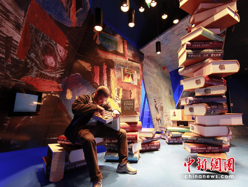 4月27日,上海世博會(huì)德國(guó)館向媒體記者開(kāi)放,一名工作人員還在緊張布置書(shū)籍堆砌的景觀。中新社發(fā) 盛佳鵬 攝