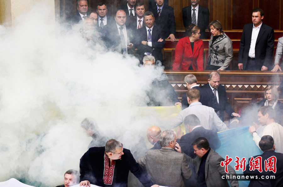 4月27日,基輔,烏克蘭議會就俄羅斯黑海艦隊(duì)駐扎問題進(jìn)行討論時(shí)出現(xiàn)混亂,數(shù)千人在議會外示威,會場內(nèi)有人投擲煙霧彈和雞蛋,大廳內(nèi)煙霧彌漫,場面一度混亂。
