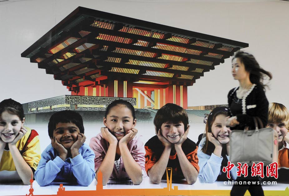 4月29日,一位女士經(jīng)過上海地鐵通道里的世博會海報(bào)前。世博會開幕前,面臨“大考”的上海充滿喜慶氣氛。 中新社發(fā) 廖攀 攝
