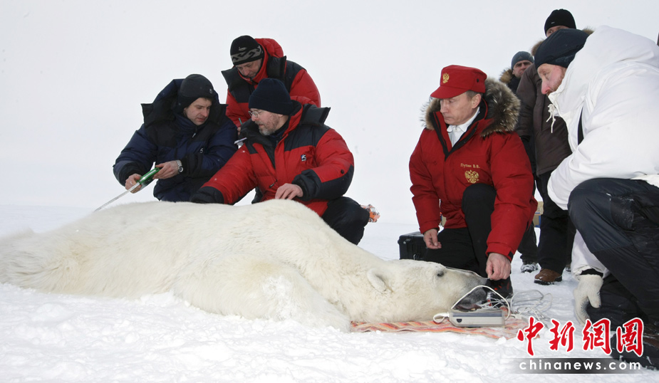 4月29日,俄羅斯總理普京參觀亞歷山大地島(法蘭士約瑟夫地群島)。 普京還與在研究學者一同給通過專門的陷阱捕獲的北極熊戴上衛(wèi)星定位項圈。此外,學者們還與普京一起給北極熊進行測量和秤體重,