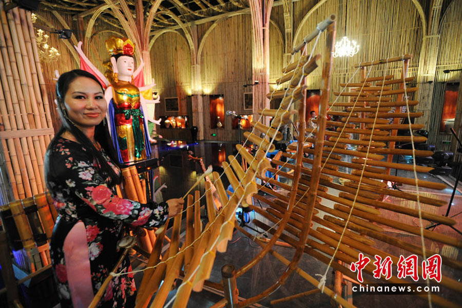 4月29日,演奏人員在越南館內(nèi)演奏竹樂器為開幕演出精心彩排。秦淮 攝