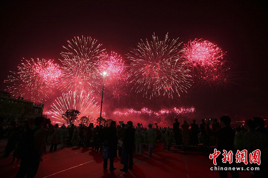 4月30日晚21時28分,在世博會焰火燈光表演開始。萬千煙花爭奇斗妍,黃浦江兩岸綿延3.28公里同時奏響火樹銀花不夜天的華彩世博樂章。圖片來源:中國新聞網