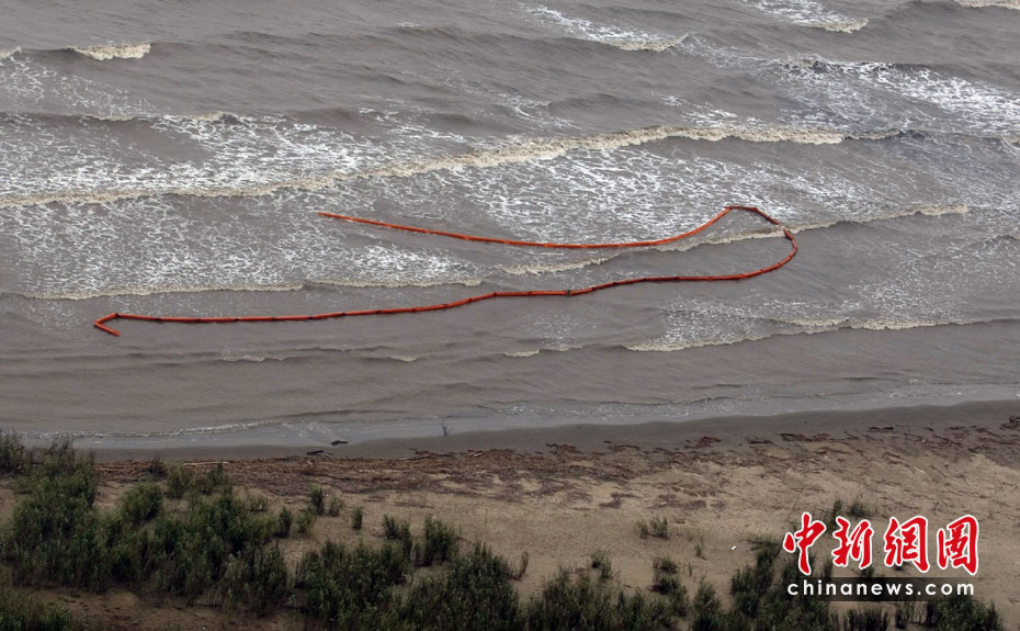 4月30日,在美國路易斯安那州海岸,為阻隔原油擴(kuò)散而設(shè)的護(hù)欄帶被海風(fēng)浪沖到岸邊。當(dāng)天,美國總統(tǒng)奧巴馬下令調(diào)查墨西哥灣石油鉆井平臺(tái)爆炸事件,以避免將來類似事件再次發(fā)生。平臺(tái)爆炸沉沒后泄漏的原油當(dāng)天已漂至美國沿岸。圖片來源:中國新聞網(wǎng)
