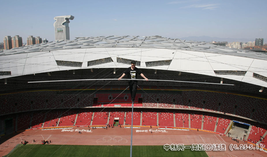 4月29日,有高空王子之稱的新疆小伙阿迪力在鳥巢上空成功試演達(dá)瓦孜(高空走鋼絲)。5月3日起,他將在北京國家體育場(鳥巢)頂棚上搭建的小屋生存60天,其間每天將進(jìn)行約5個(gè)小時(shí)的高空走鋼絲表演。 圖片來源:中國新聞網(wǎng)>>點(diǎn)擊觀看詳細(xì)內(nèi)容