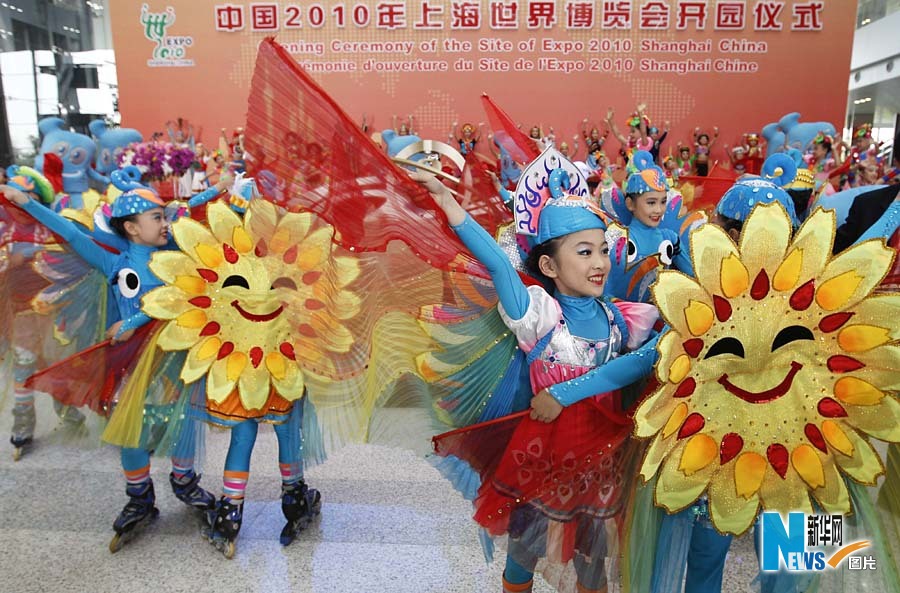 5月1日,中國2010年上海世博會(huì)開園儀式在上海世博園世博中心舉行。這是小朋友們在開園儀式上表演。裴鑫攝(新華網(wǎng))