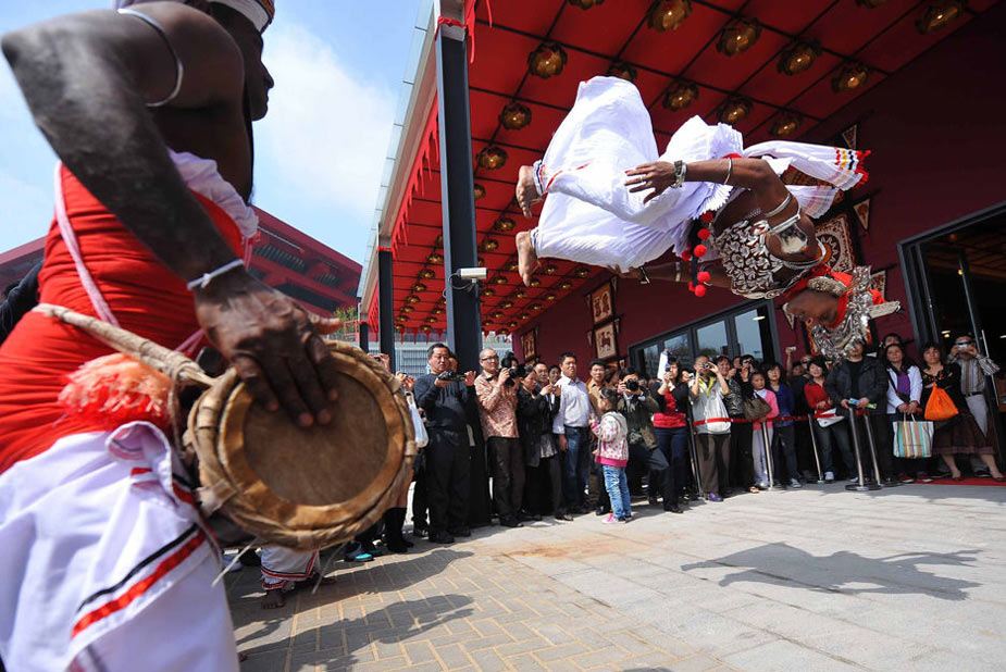 5月1日,上海世博會正式開園迎客,首批游客入園參觀。圖為斯里蘭卡館門口的舞蹈表演吸引眾多參觀者駐足觀看。 羅曉光 攝