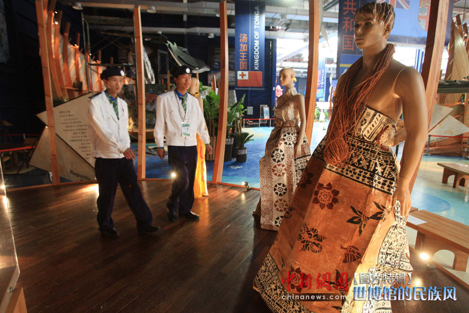 5月1日,上海世博會(huì)開園第一天,斐濟(jì)國(guó)的手繪樹皮時(shí)裝在太平洋聯(lián)合館展出。中新社發(fā) 潘索菲 攝
