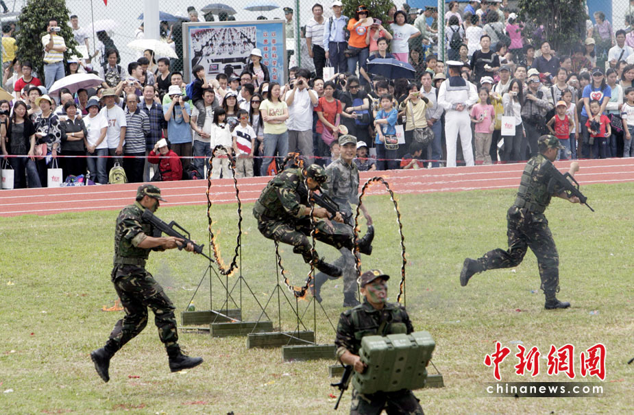 為慶祝“五一”國際勞動節(jié),進一步增進與香港社會各界相互溝通與交流,中國人民解放軍駐香港部隊5月1日開放了昂船洲軍營,圖為“獵人戰(zhàn)斗”表演。中新社發(fā) 張勤 攝