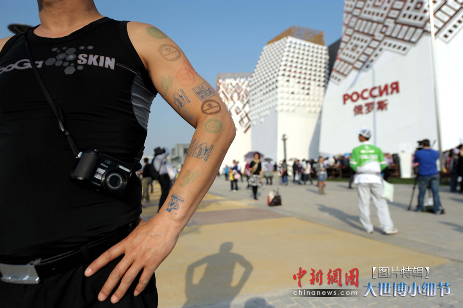 5月1日,上海世博會(huì)正式開(kāi)園,當(dāng)日有20萬(wàn)人次的游客參觀了世博園。世博首日,許許多多的小細(xì)節(jié)都帶給人一種全新的體驗(yàn)。圖為一男子胳膊上蓋滿世博園多個(gè)展館通行紀(jì)念印章,收獲頗豐。中新社發(fā) 陳文 攝