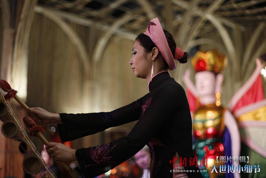 5月1日,上海世博會正式開園,當日有20萬人次的游客參觀了世博園。世博首日,許許多多的小細節(jié)都帶給人一種全新的體驗。圖為越南館為入館參觀的來賓演奏獨特的竹制樂器。中新社發(fā) 盛佳鵬 攝