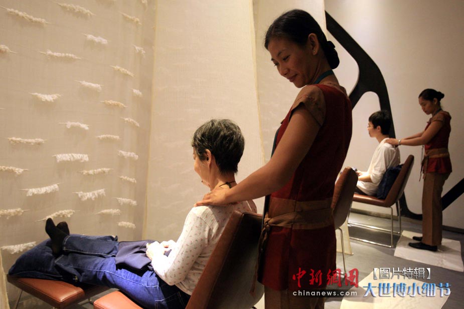 5月1日,上海世博會正式開園,當(dāng)日有20萬人次的游客參觀了世博園。世博首日,許許多多的小細(xì)節(jié)都帶給人一種全新的體驗(yàn)。圖為菲律賓館的傳統(tǒng)按摩。中新社發(fā) 潘索菲 攝