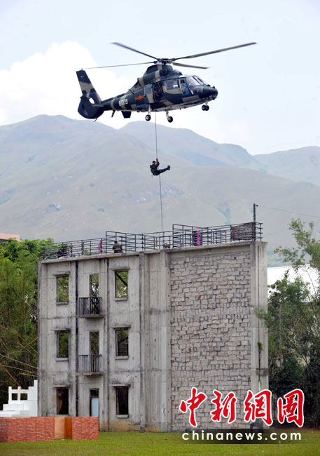 為慶!拔逡弧眹H勞動節(jié),進(jìn)一步增進(jìn)與香港社會各界相互溝通與交流,中國人民解放軍駐香港部隊5月2日開放了石崗軍營。圖為駐港部隊反恐突擊和陸空協(xié)同救援演練表演。 中新社發(fā) 鄧慶樂 攝