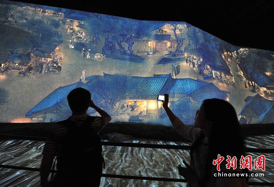5月2日,中外觀眾依然最熱捧上海世博會中國館的“鎮(zhèn)館之寶”——巨幅放大電子動態(tài)版的北宋畫家張擇端名作《清明上河圖》。此世博版的《清明上河圖》高6.3米,長130余米,約是原圖的30倍,需要12臺電影級的投影儀同時(shí)工作。整個(gè)活動畫面以4分鐘為一個(gè)周期,盡展宋朝盛世的都市日夜風(fēng)情。中新社記者 賈國榮 攝