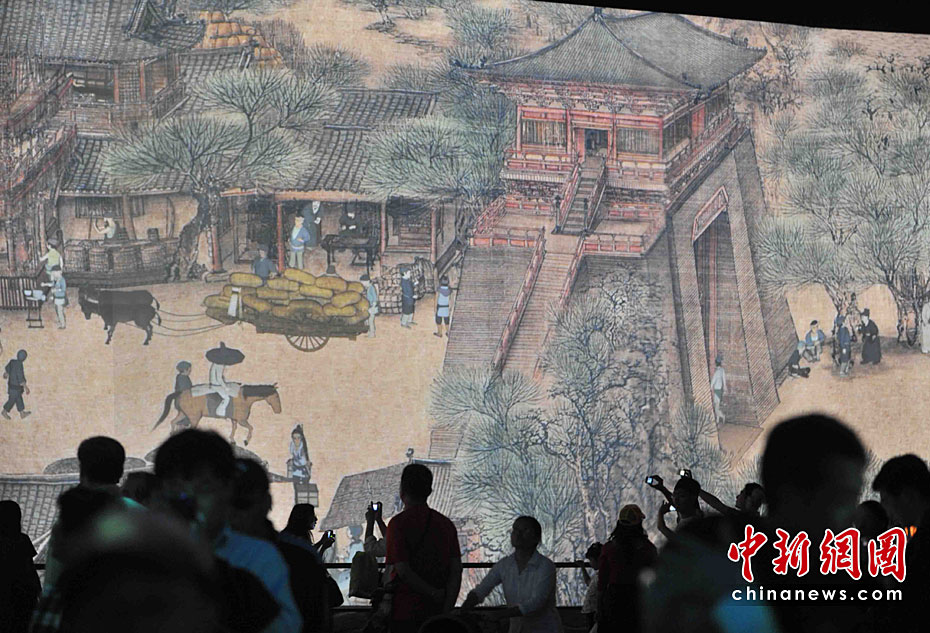 5月2日,中外觀眾依然最熱捧上海世博會中國館的“鎮(zhèn)館之寶”——巨幅放大電子動態(tài)版的北宋畫家張擇端名作《清明上河圖》。此世博版的《清明上河圖》高6.3米,長130余米,約是原圖的30倍,需要12臺電影級的投影儀同時工作。整個活動畫面以4分鐘為一個周期,盡展宋朝盛世的都市日夜風情。中新社記者 賈國榮 攝