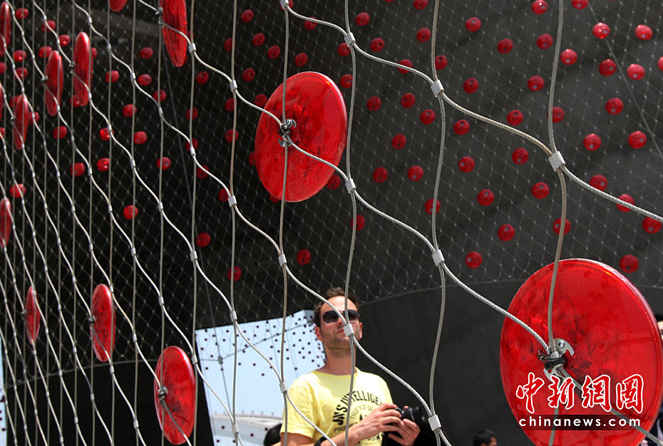 5月2日,上海世博會是第一個正式提出“低碳世博”理念的世博會,圍繞著這樣的理念,上海世博園區(qū)內(nèi)的低碳元素比比皆是。圖為瑞士館用大豆纖維制成的紅色幕帷,能發(fā)電,可天然降解。中新社發(fā) 湯彥俊 攝