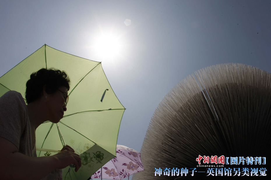 上海世博園開(kāi)園才數(shù)日,自號(hào)“種子圣殿”的英國(guó)館已成人氣最旺場(chǎng)館之一。該館由6萬(wàn)根亞克力桿巧妙構(gòu)成,隨風(fēng)搖動(dòng),頗為新奇。其每根桿子里都含有植物種子。中新社記者 盛佳鵬 攝