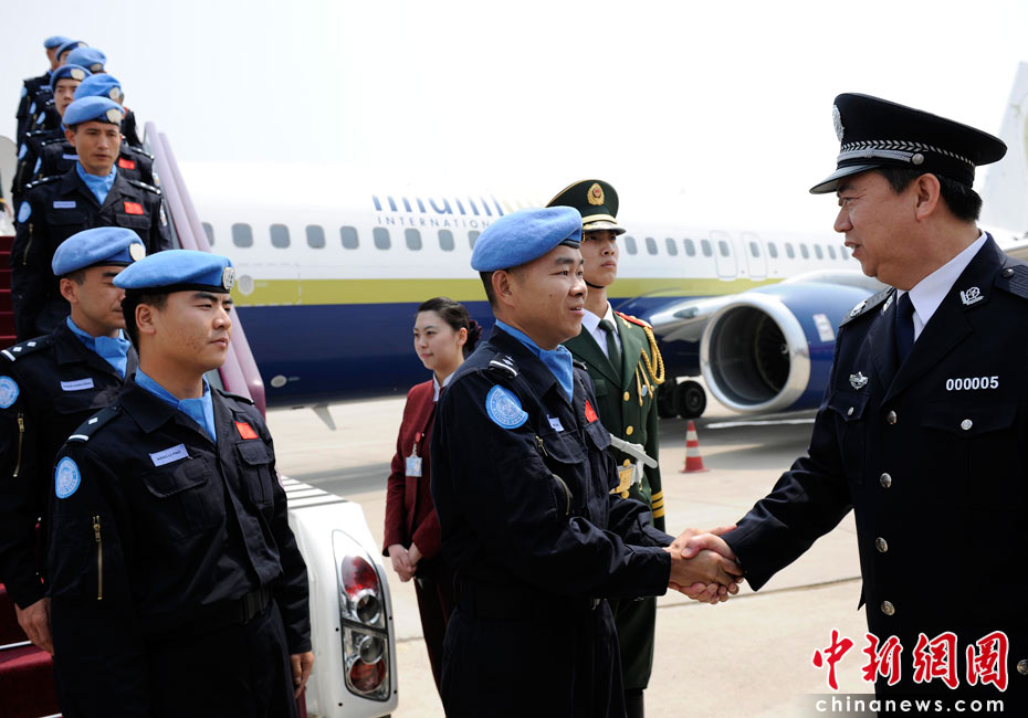 5月4日,中國第八支赴海地維和警察防暴隊全體隊員乘坐聯(lián)合國包機(jī)返回祖國。公安部副部長孟宏偉、政治部主任蔡安季前往機(jī)場迎接。 中新社發(fā) 劉震 攝