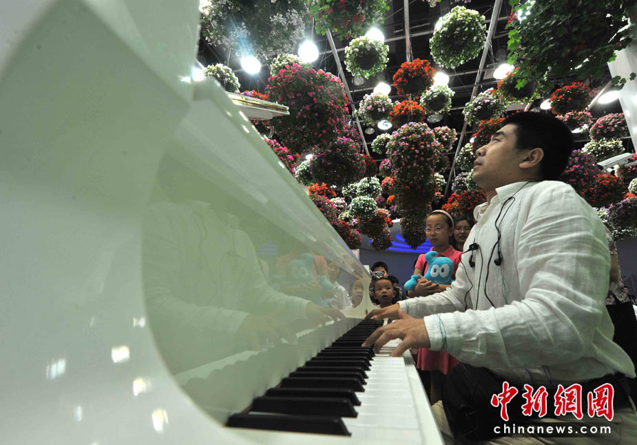 5月4日是上海世博會第四天,盲人鋼琴家孫巖在生命陽光館專設(shè)區(qū)域?yàn)楸姸鄽埣踩撕陀^眾演奏,導(dǎo)盲犬靜臥在他的腳邊,這是世博會歷史上第一次為殘疾人設(shè)館。孫巖2005年獲得“日本橫濱第一屆國際殘疾人鋼琴比賽”金獎,他是中央音樂學(xué)院有史以來第一位盲人大學(xué)生和研究生。他的傾情演奏感動全場,掌聲連連。中新社發(fā) 賈國榮 攝