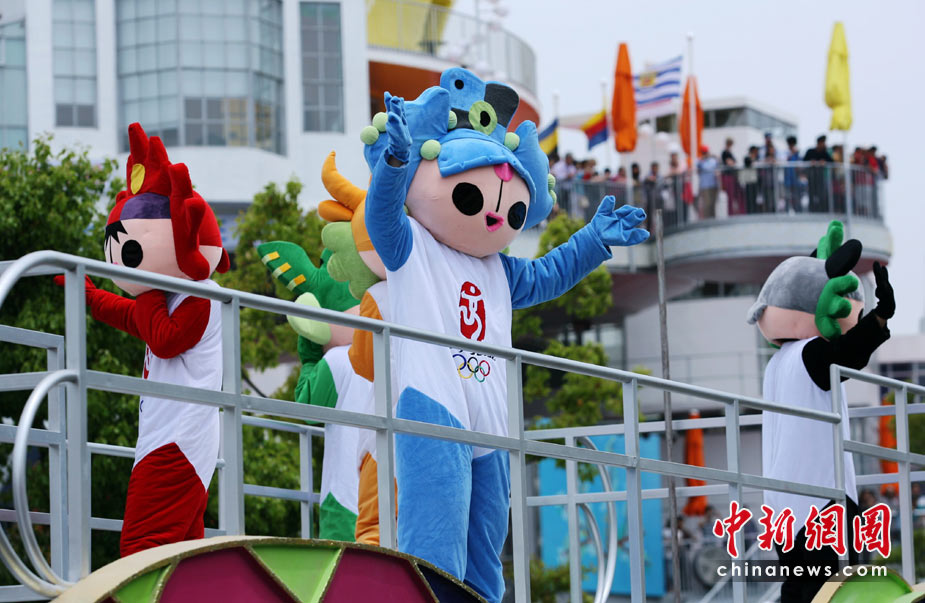 5月4日,世博會(huì)北京周花車巡游中的福娃向觀眾揮手致意。當(dāng)日,世博會(huì)北京周開幕。
