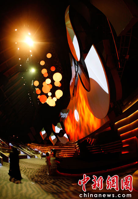 2010年5月4日,上海世博園區(qū)迎來首個平日票的參觀客潮。圖為準備好迎接游客的阿聯(lián)酋館的影院。中新社發(fā) 盛佳鵬 攝