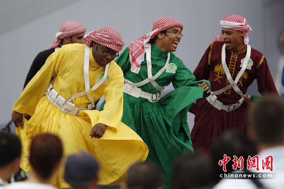 2010年5月4日,上海世博園區(qū)的亞洲廣場(chǎng),沙特阿拉伯藝術(shù)團(tuán)為游客表演。 中新社發(fā) 盛佳鵬 攝