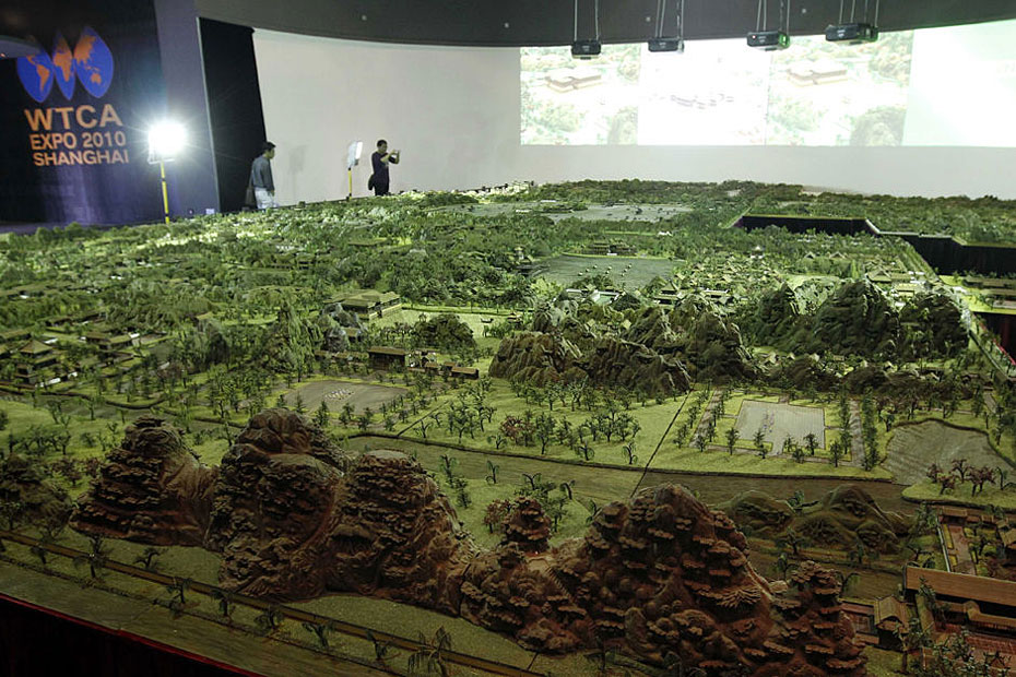 5月4日,游客在參觀縮微版“圓明園”。近日,一座“全景式巨型立雕圓明園”在上海世博會世界貿(mào)易中心協(xié)會館亮相。這座縮微版的“圓明園”以1比150的比例制作而成,再現(xiàn)了全盛時期的圓明園雄偉壯觀的全景。圖片來源:新華網(wǎng) 裴鑫 攝
